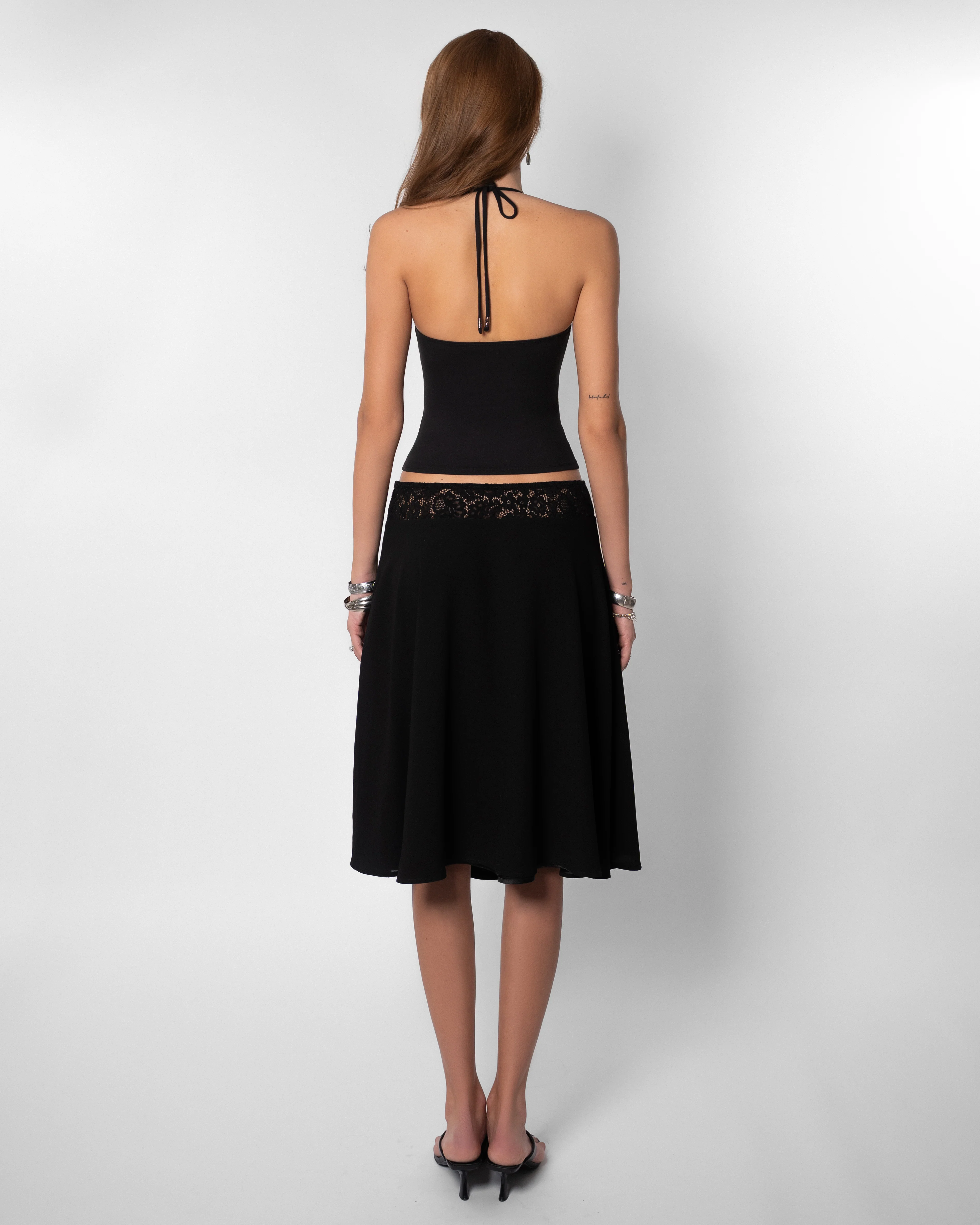 The Bloom Skirt is soft and romantic, designed in a flowing fabric with a delicate floral lace waistband. It’s fully lined for comfort and coverage, with a hidden side zipper for a smooth, secure fit. Cut to a flattering midi length, it moves beautifully with every step. Style it with the matching Tank Top for a classy minimalistic 90s look.