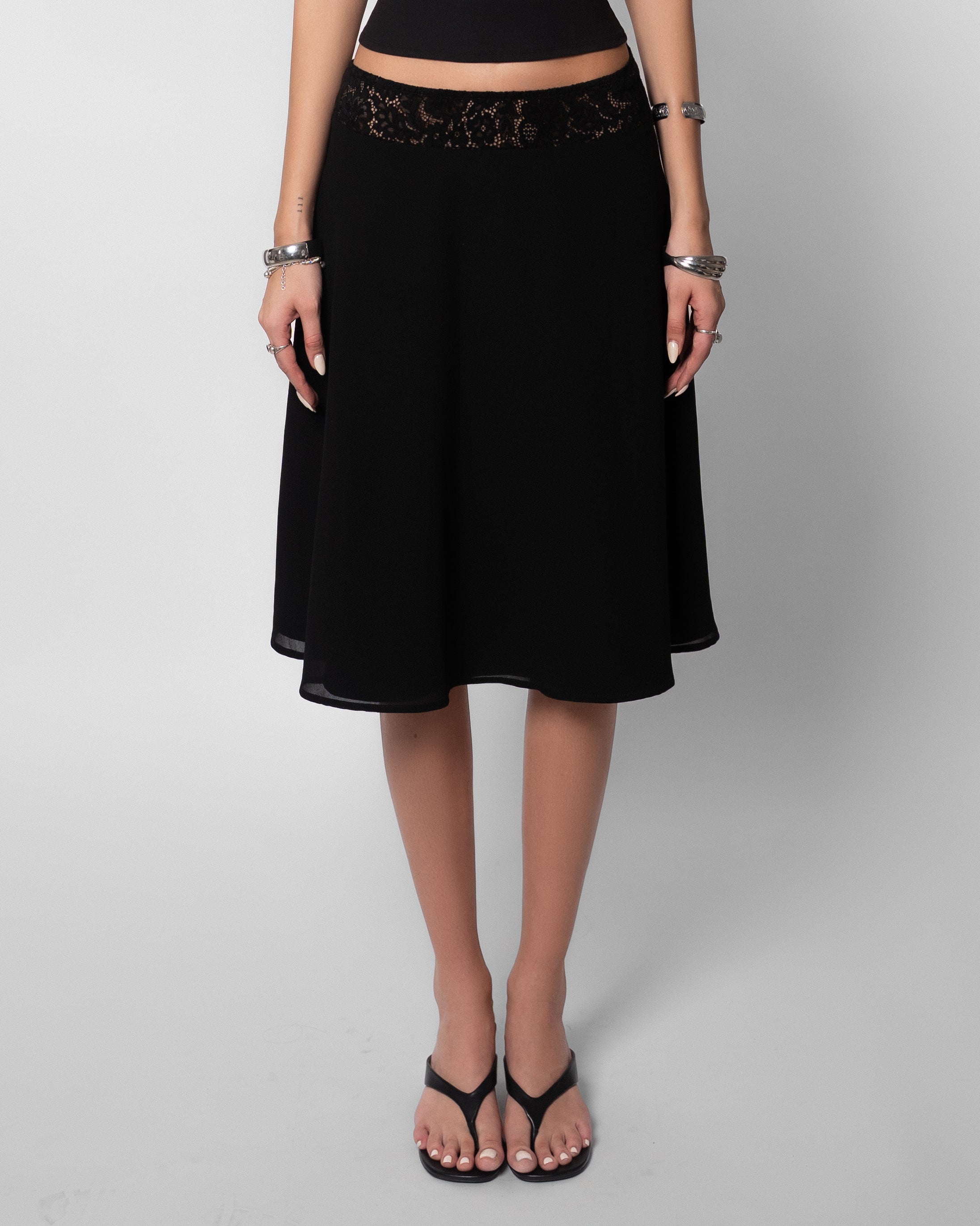 Model is 5'10 wearing size S The Bloom Skirt is soft and romantic, designed in a flowing fabric with a delicate floral lace waistband. It’s fully lined for comfort and coverage, with a hidden side zipper for a smooth, secure fit. Cut to a flattering midi length, it moves beautifully with every step. Style it with the m